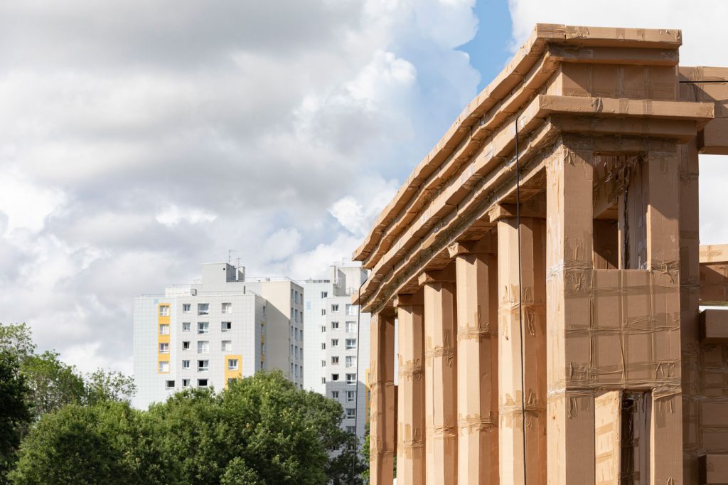 Ils s’étaient donné rendez-vous au quartier de la Vallée Verte de la Roche-sur-Yon fin juin 2021. Sans grue ni machine, il aura fallu 5 jours de travail aux 300 participants emmenés par l’artiste plasticien Olivier Grossetête, une bonne dose d’huile de coude, 1200 cartons bruns et pas loin de 5 kilomètres de scotch pour réaliser un théâtre à l’italienne éphémère de 3 étages, intégralement en cartons brun.